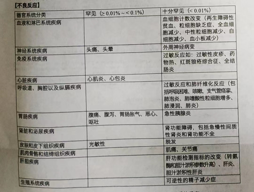 1. 根据医生判定,必要时在治疗前和治疗过程中检查血象(血细胞分类计数,肝功能参数如 ALT或AST,血肌酐)和尿液状况(试纸)。建议开始治疗后14天检查这些项目,此后每隔4周进一步复查2-3次。如检...