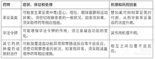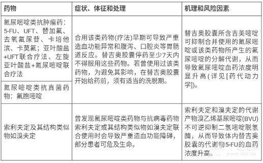 4.本药不得与其它氟尿嘧啶类抗肿瘤药、含氟尿嘧啶类药物的化疗方案[如亚叶酸盐/替加 氟—尿嘧啶(UFT)联合化疗]、抗真菌药氟胞嘧啶等合用,可能导致严重造血功能障碍等不良 反应(见[药物相互作用])。