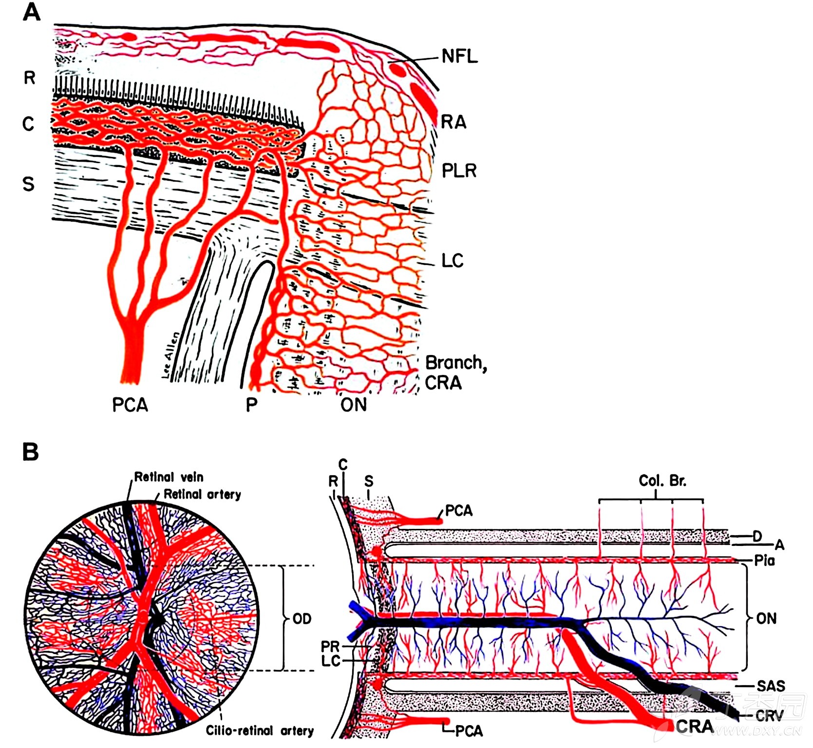③ 神经源性假说:在 ONH 中,没有太多的证据证明这一点,因为视网膜和 ONH 的血管没有自主神经,但两者仍具有自身调节功能。相比之下,脉络膜虽然有丰富的自主神经,但没有明显的自身调节功能。