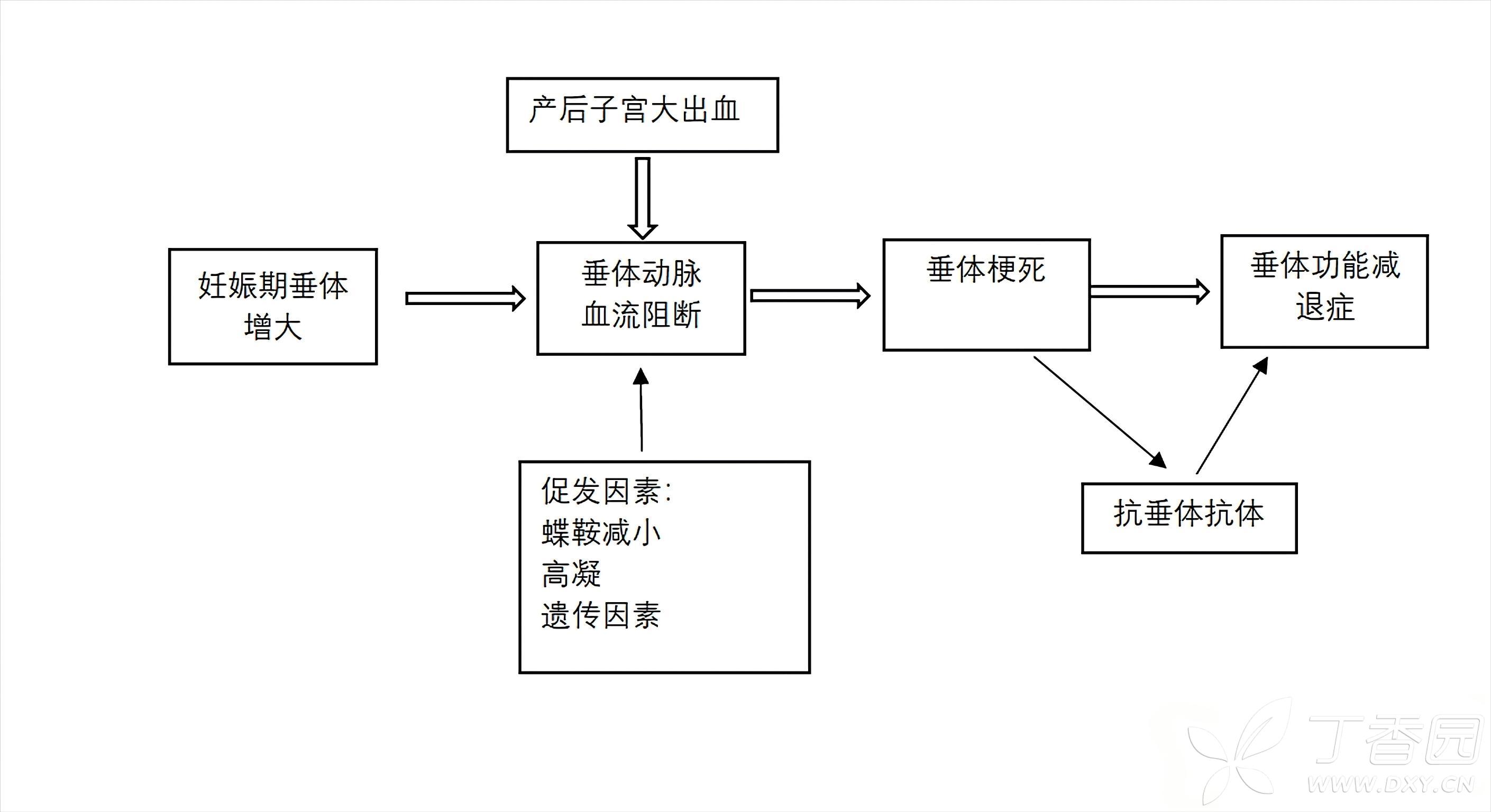 SS 时流向垂体的动脉血流中断一般是由于大量 PPH 所致。然而,已报告罕见病例发生垂体功能减退症但未发生重度 PPH7,18-19。值得一提的是,在这些病例中,产后垂体功能减退是由于急性肝衰竭或过敏性休克所致。与 PPH 无关的其他病理状况也可导致妊娠期垂体缺血:重度头部创伤、蛛网膜下腔出血、急性垂体卒中、心脏病、大面积卒中、重度非产科出血、糖尿病和急性出血热8-10,20-23。然而,难以将妊娠期间因重度 PPH 以外原因发生的垂体功能减退归类为 SS。