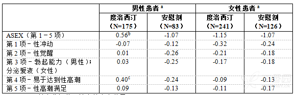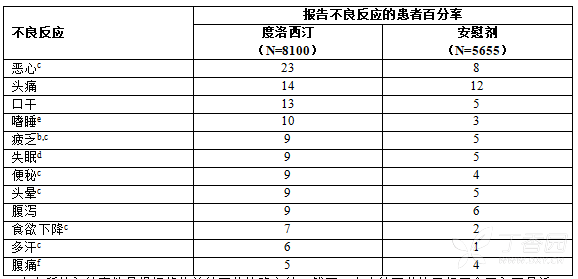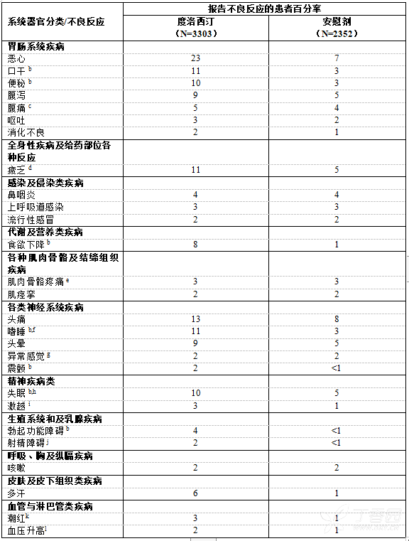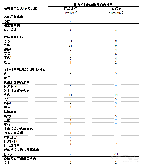 a 表中所纳入的事件是根据修约前的百分比确定的;然而,表中的百分比已经四舍五入至最近的整数。b 还包括乏力。 c 在固定剂量研究中有显著剂量依赖关系的事件,不包括 3 项没有安慰剂导入期或剂量递增的抑郁症研究。d 还包括入睡困难、中期失眠和早醒。 e 还包括睡眠过度和镇静。 f 还包括腹部不适、下腹部疼痛、上腹部疼痛、腹部触痛和胃肠疼痛。