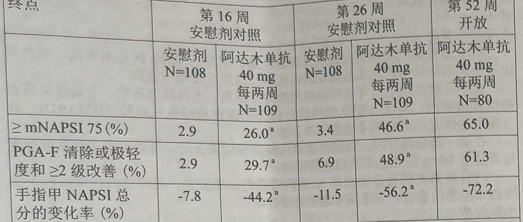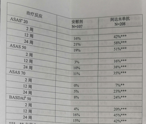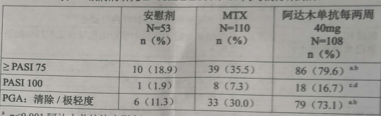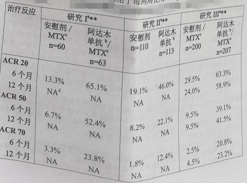 a 研究 I 24 周时,研究 II 26 周时,研究 III 24 周和 52 周时。b 每两周使用 40 mg 阿达木单抗。 c MTX = 甲氨蝶呤。d NA 未检测。** p<0.01,阿达木单抗比安慰剂。