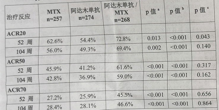 在 RA 研究 I-IV 中,与安慰剂相比较,所有的 ACR 反应评价标准(关节疼痛和关节肿胀数、患者和医生对疾病和疼痛的评分、健康评估量表(HAQ)评分以及 CRP(mg/dl)数值)均在 24 或 26 周出现了改善。在研究 III 中,这些改变持续了 52 周。在 RA 研究 III 的拓展开放研究中,绝大多数取得了 ACR 反应的患者在 10 年中疗效得以保持。在 207 名患者中,114 名患者在 5 年中连续每两周使用 40 mg 阿达木单抗。在这些患者中,86 名患者(75.4%)达到 ACR20;72 名患者(63.2%)达到 ACR50;41 名患者(36%)达到 ACR70。在 207 名患者中,81 名在 10 年中连续每两周使用 40 mg 阿达木单抗。在这些患者中,64 名患者(79.0%)达到 ACR20;56 名患者(69.1%)达到 ACR50;43 名患者(53.1%)达到 ACR70。在 RA 研究 IV 中,使用阿达木单抗加常规药物治疗患者 ACR20 的治疗反应显著优于安慰剂加常规治疗的患者(p<0.001)。在 RA 研究 I-IV 中,接受阿达木单抗治疗的患者达到具有统计学意义的 ACR20 和 50 治疗反应所需的时间比安慰剂治疗的患者早 1-2 周。RA 研究 V 中从未接受过甲氨蝶呤治疗的早期类风湿关节炎患者,与甲氨蝶呤单独用药和阿达木单抗单独用药相比,使用阿达木单抗与甲氨蝶呤联合治疗可以获得较快的治疗反应,在 52 周时具有显著的 ACR 治疗反应,并且在 104 周时这些治疗反应保持稳定(见表 3)。