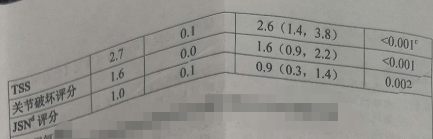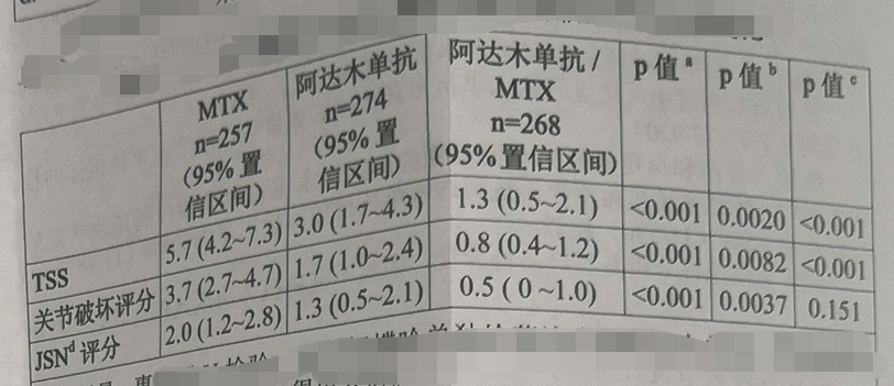 a. 甲氨蝶呤 b. 甲氨蝶呤和阿达木单抗之间评分改变差异的 95% 置信区间 c. 基于等级分析 d. 关节间隙狭窄