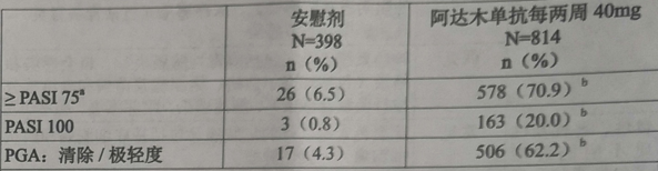 在四个严格对照的研究中,使用健康评估量表(HAQ)对患者健康相关的生活质量和身体机能进行评估,这是研究 III 中预先确定的 52 周时评估的主要终点。与安慰剂组相比,四个研究中使用阿达木单抗的各组均表现显著的 HAQ 评分改善;而在第 52 周,研究 III 中观察到了同样的结果;简明健康调查表(SF36)的结果、具有显著统计学意义的生理健康评分(PCS)以及显著统计学意义的疼痛及活动性评分也支持同样的结果。在研究 I,III 和 IV 中,通过慢性疾病治疗评分(FACIT)评估,患者的疲劳度下降。