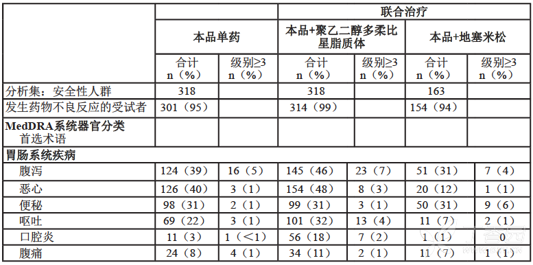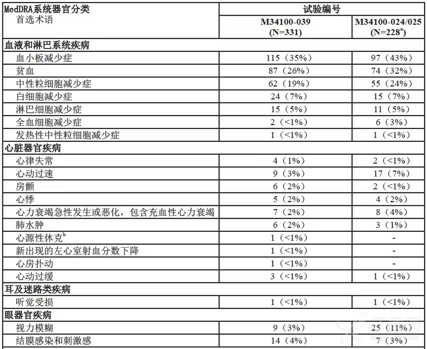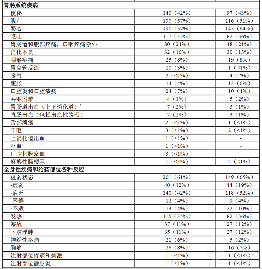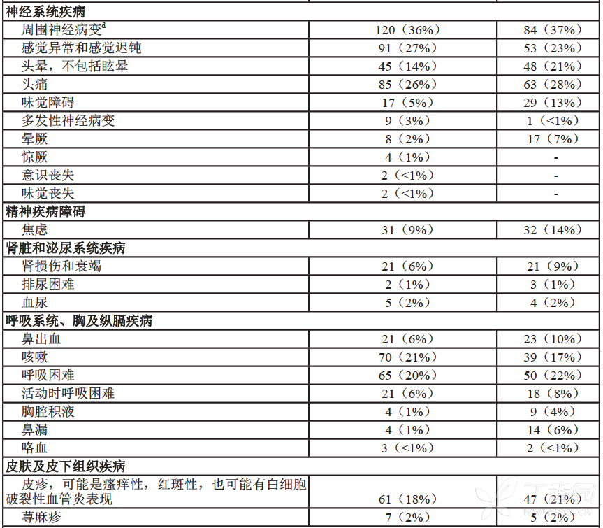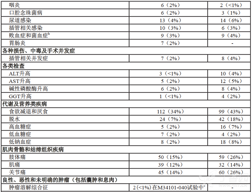 a 所有 228 名患者接受硼替佐米的剂量为 1.3 mg/m2 b 包括致死性结果 c 一项硼替佐米以 1.3 mg/m2推荐剂量治疗多发性骨髓瘤的研究,患者曾接受过至少 4 种疗法或在方案 M34101-039 中接受高剂量地塞米松后病情恶化。 d 包括在 MedDRA HLT“周围神经病变(不另分类)”下面的所有首选术语