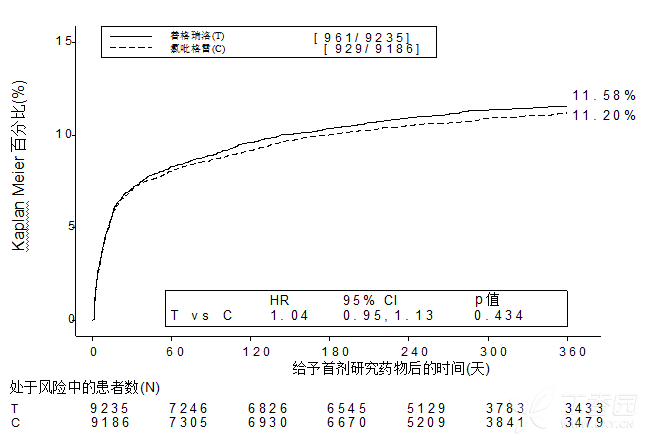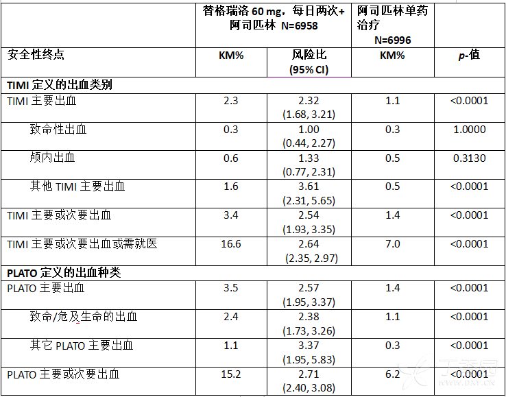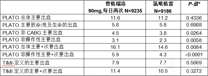 心血管死亡、心肌梗死或卒中的复合终点 心血管死亡 非致命性心肌梗死 非致命性卒中 | 替格瑞洛 N = 9333 9.8 2.9 5.8 1.4 | 氯吡格雷 N = 9291 11.7 4.0 6.9 1.1 | 风险比(95%CI) 0.84(0.77,0.92) 0.74 0.84 1.24 | p-值 0.0003 |